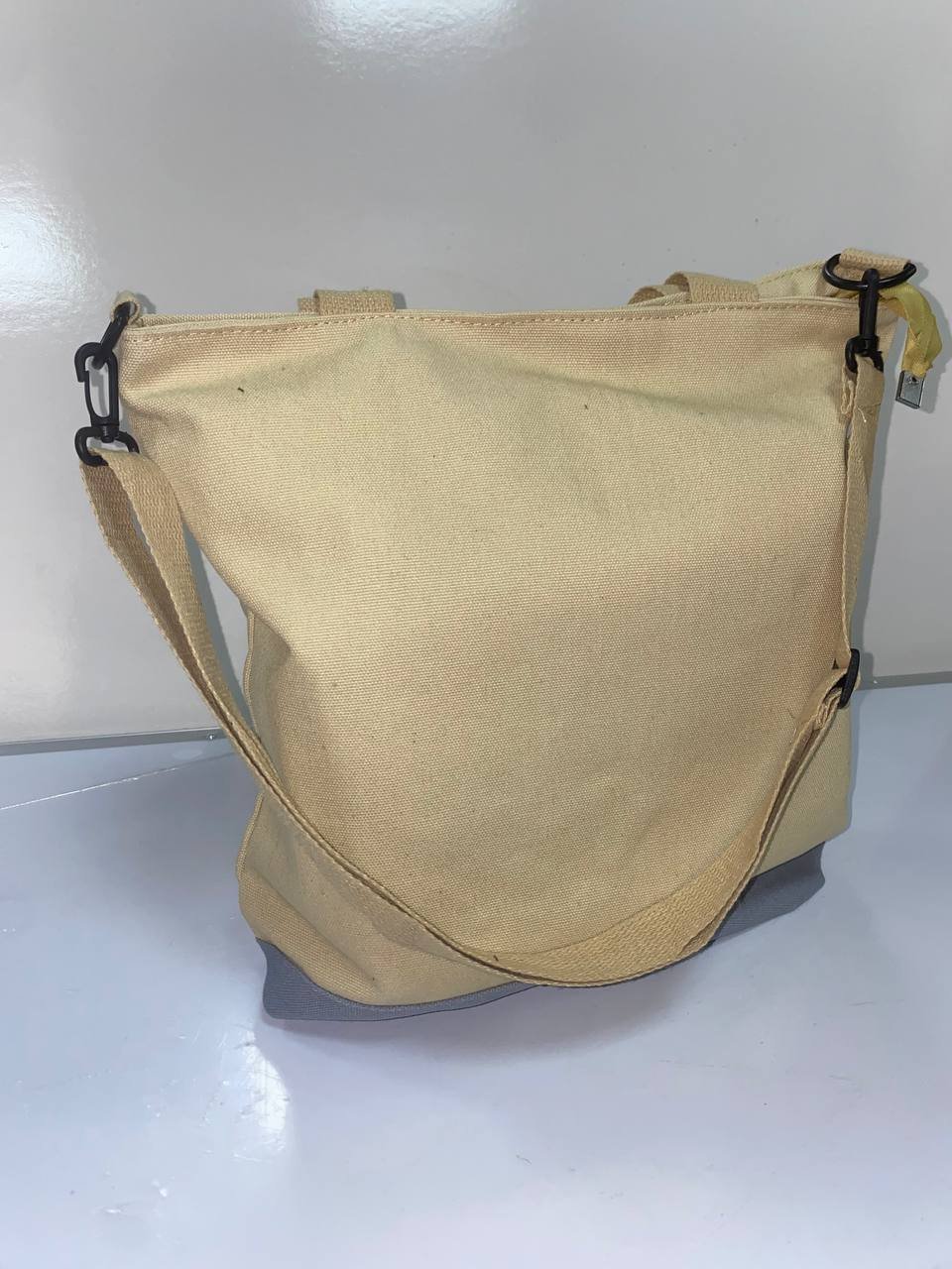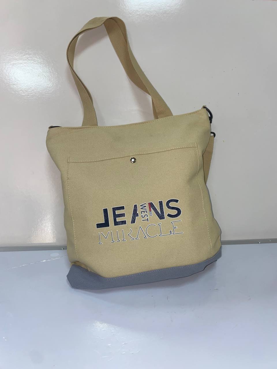 حقيبة نسائية أنيقة وعصرية مصنوعة من قماش متين باللون البيج مع طبعات حروف كبيرة باللون الأسود تمنحها مظهراً شبابيًا وجريئًا.
