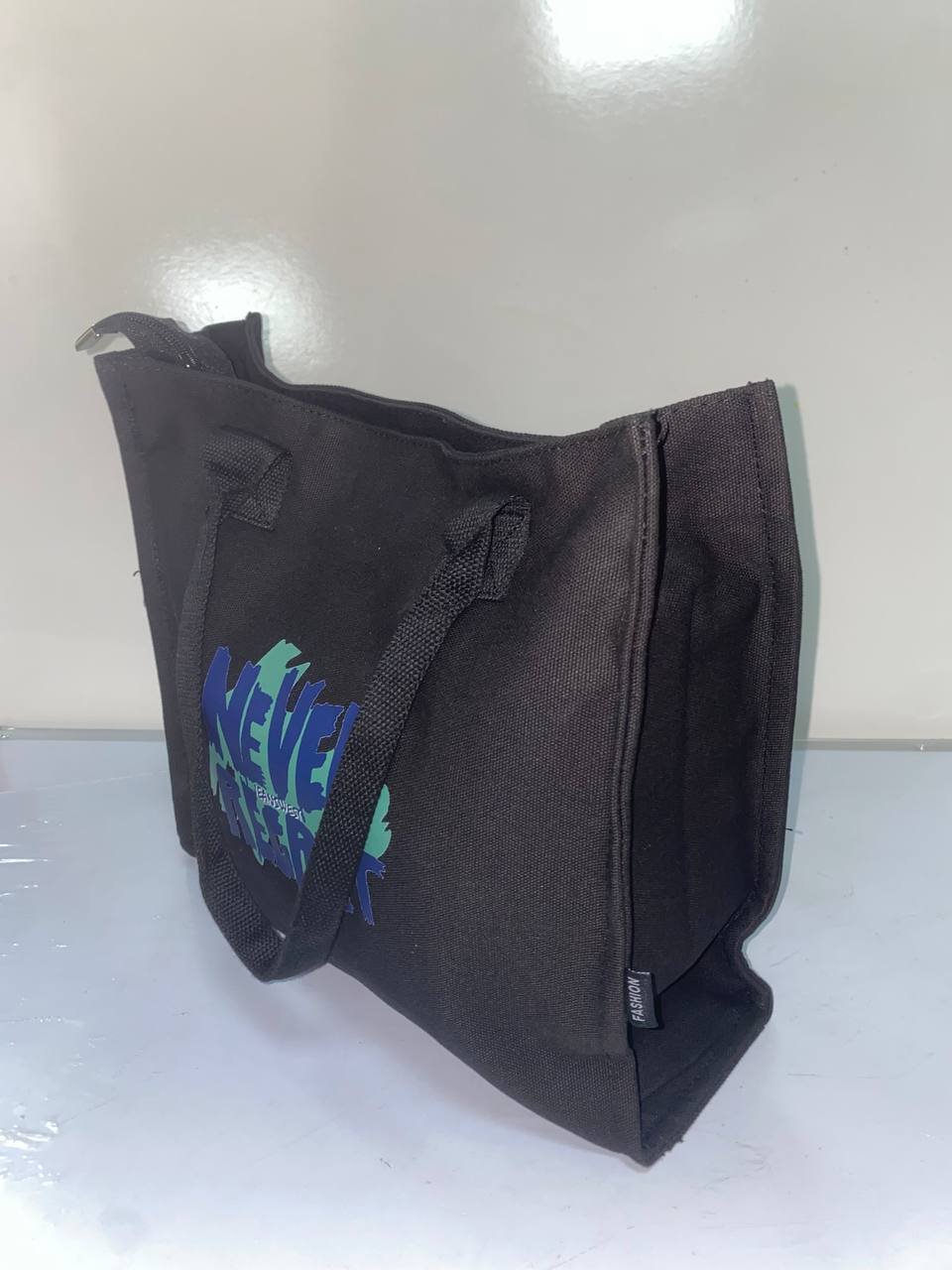 حقيبة نسائية أنيقة وعصرية مصنوعة من قماش متين باللون اللون الأسود مع طبعات حروف كبيرة باللون الأسود تمنحها مظهراً شبابيًا وجريئًا.