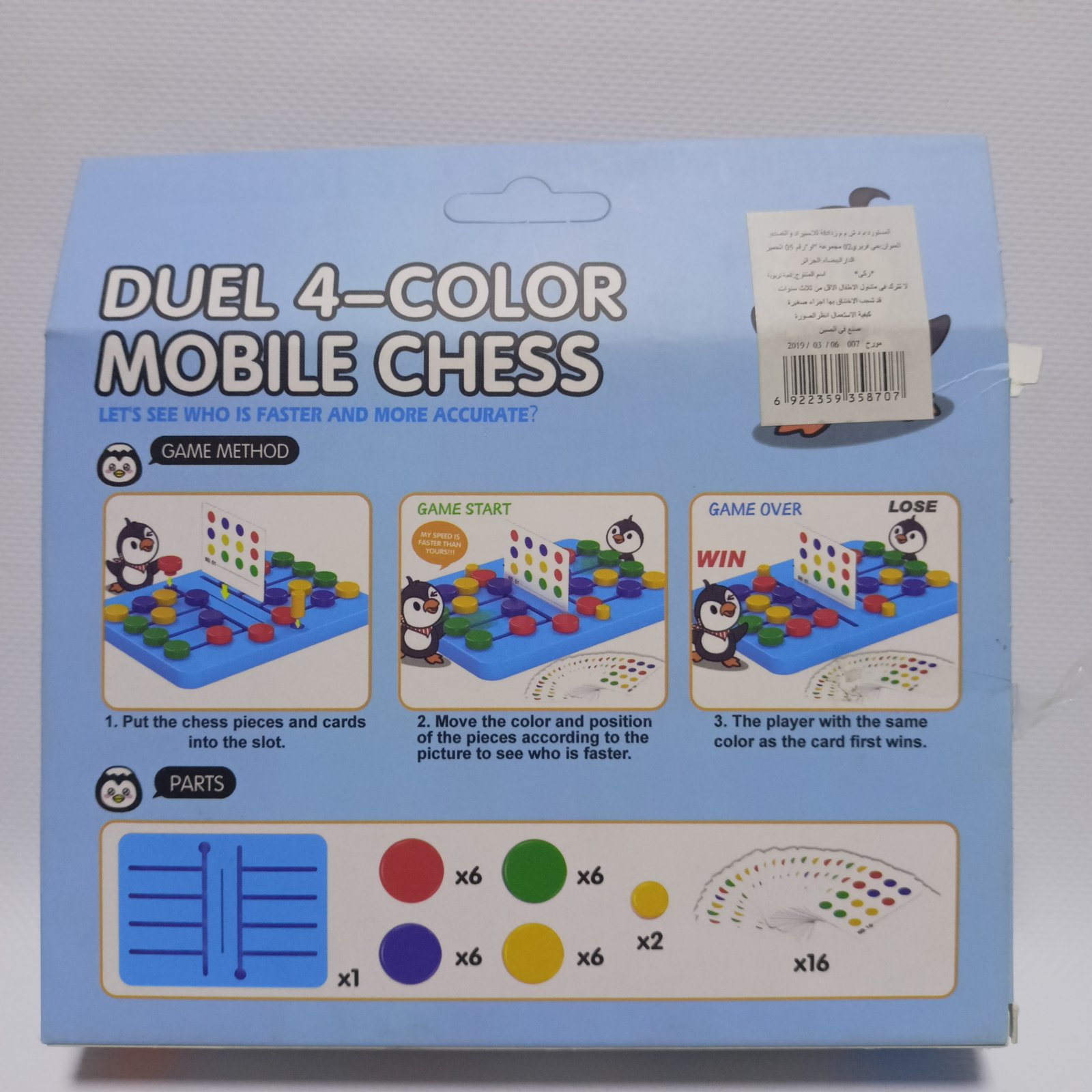 سعر التوصيل 75 ألف لمعظم الولايات. Duel 4-Color Mobile Chess – لعبة التحدي بأربعة ألوان لعبة سريعة تعتمد على السرعة والدقة في ترتيب القطع حسب النموذج. تساعد على تنمية سرعة الاستجابة والتركيز، وتعزز القدرة على الملاحظة والانتباه للتفاصيل.
