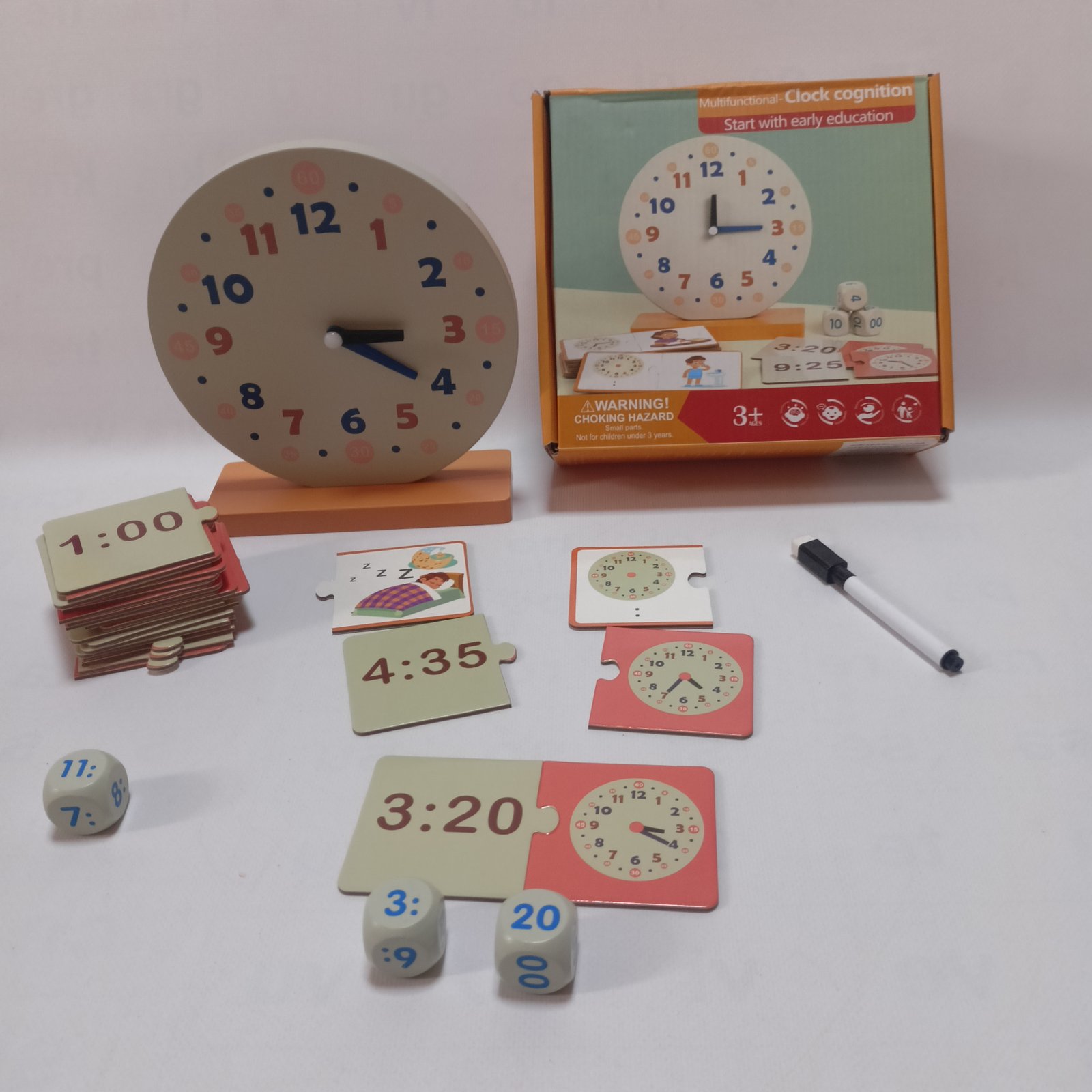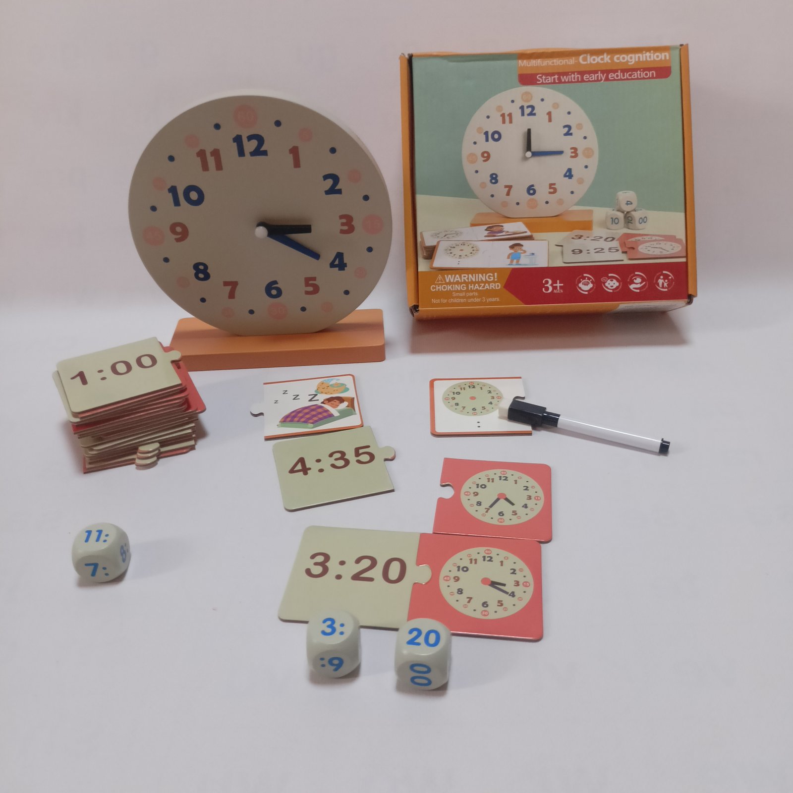 تجمع هذه اللعبة بين التعلم العملي والتفاعل، حيث يمكن للطفل التعرف على الوقت باستخدام الساعة، وتعلم الأرقام من خلال المكعبات، وربطها مع بطاقات تعليمية.