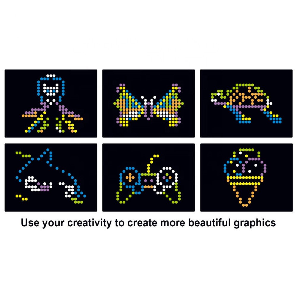 لوحة إضاءة أكبر وأكثر سطوعًا، مع دبابيس لامعة إضافية بألوان رائعة تسمح للأطفال بصنع رسومات مذهلة تتوهّج عند تشغيل الإضاءة.