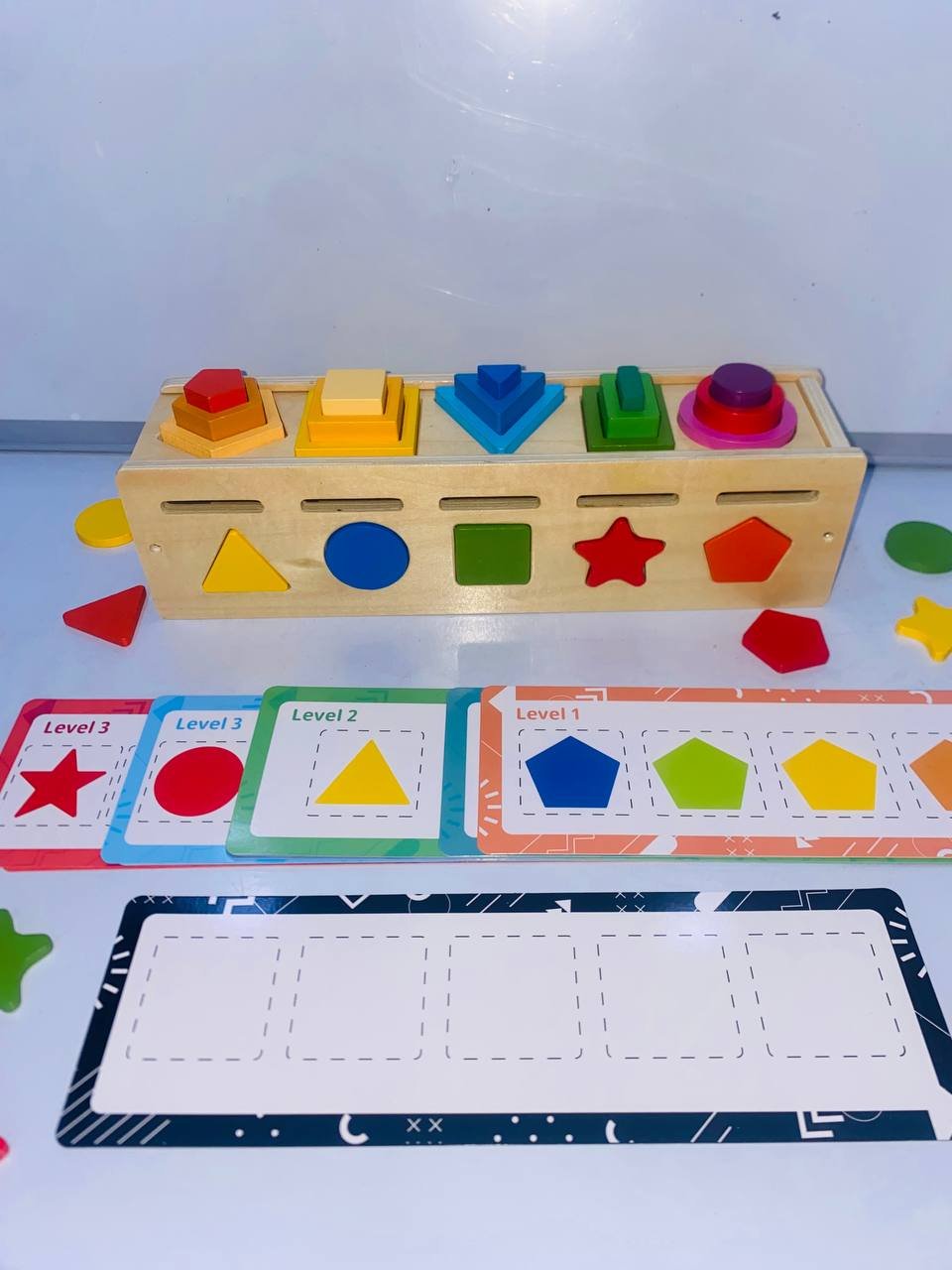 بسيطة جدًا! يأتي الصندوق مع مجموعة من القطع الملونة بأشكال جذابة. مهمة طفلك هي مطابقة كل قطعة مع اللون المناسب ودفعها من خلال الفتحة المطابقة على غطاء الصندوق. هذه الحركة البسيطة تعلمه التصنيف والتطبيق العملي للمفاهيم.