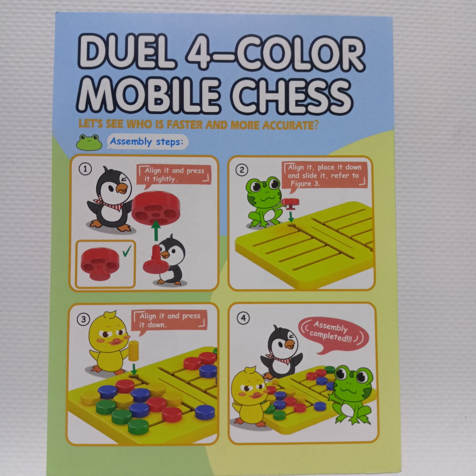 سعر التوصيل 75 ألف لمعظم الولايات. Duel 4-Color Mobile Chess – لعبة التحدي بأربعة ألوان لعبة سريعة تعتمد على السرعة والدقة في ترتيب القطع حسب النموذج. تساعد على تنمية سرعة الاستجابة والتركيز، وتعزز القدرة على الملاحظة والانتباه للتفاصيل.