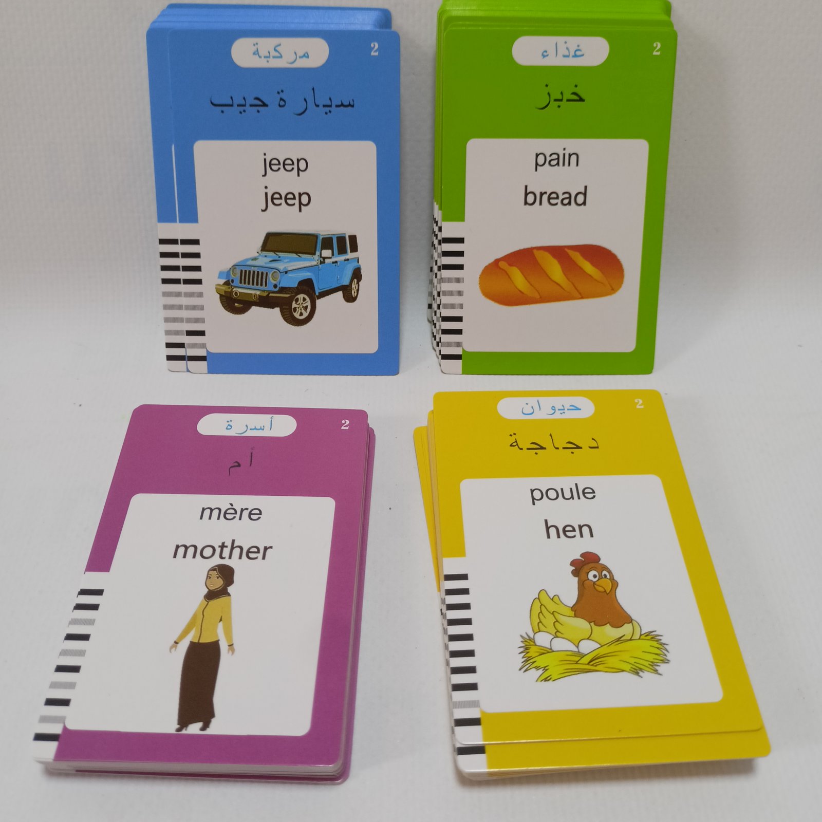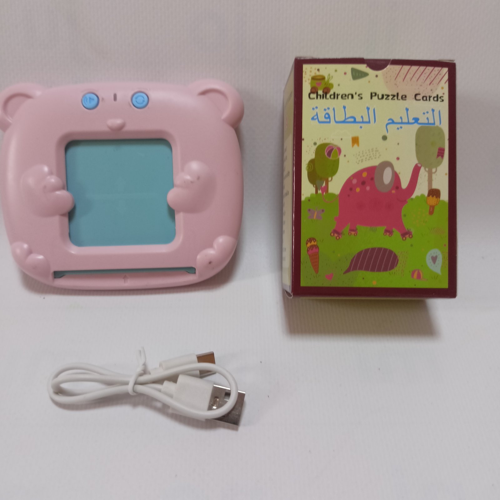 يقدم هذا الجهاز محتوى تعليمي متنوع يشمل الحيوانات، الأطعمة، الألوان، والأشياء اليومية بثلاث لغات.