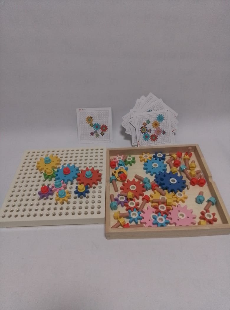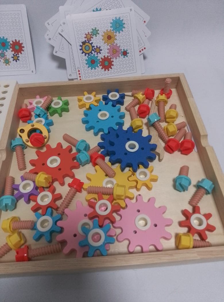 يقوم الطفل بوضع التروس حسب شكل البطاقة، ثم يثبتها بالبراغي، وبعدها يدير أحد التروس فيبدأ الباقي بالدوران في سلسلة ميكانيكية ممتعة تُظهر مبدأ الحركة والترابط.
