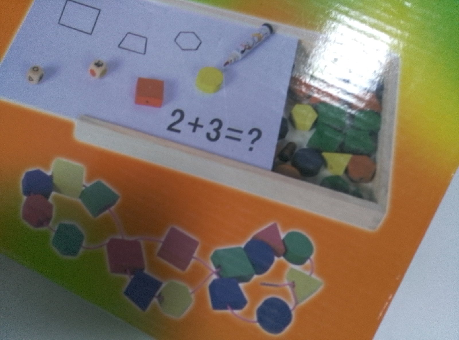 صندوق خشبي صغير مع وجه أبيض يمكن تعليقه ويمكّن الطفل من كتابة عمليات بسيطة أو رسم شكل المجسم المطلوب.