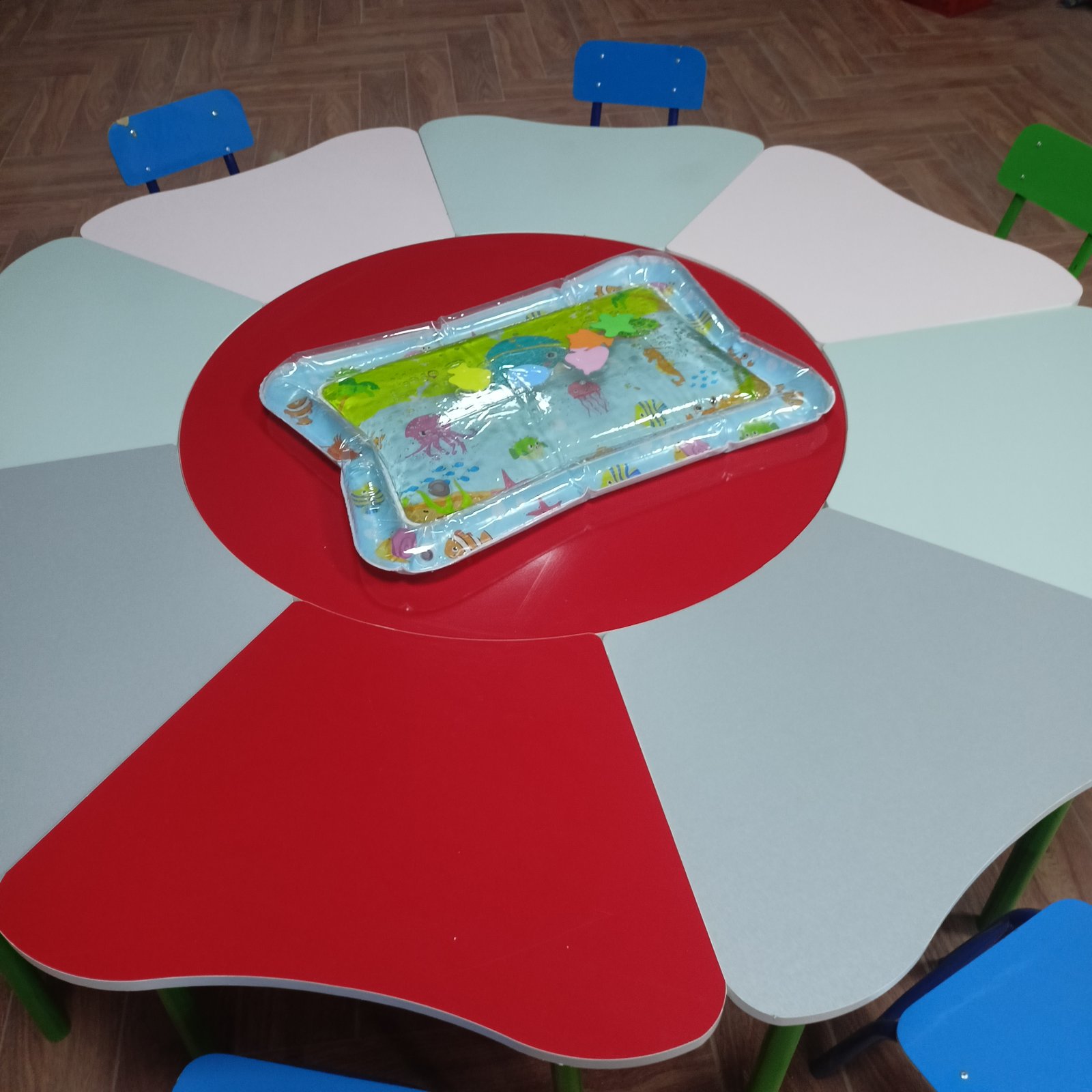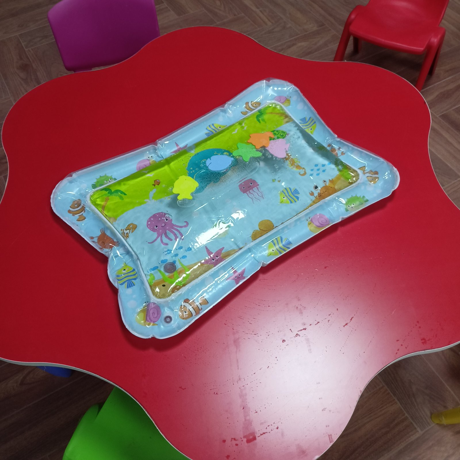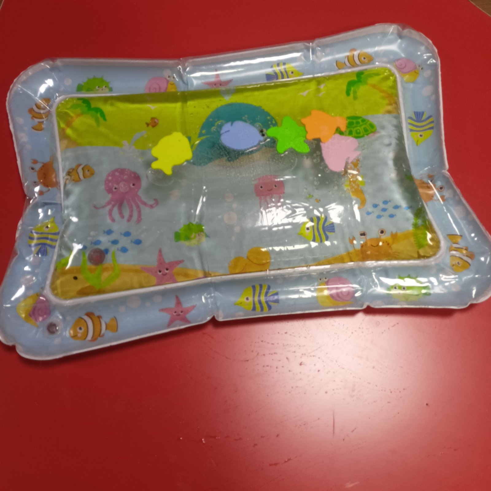 وسيلة حسية تساعد الطفل خلال وقت اللعب على البطن. تعمل على تقوية عضلات الجسم وتحفيز الحركة، كما تنمي الإدراك الحسي من خلال الماء والألوان والأشكال المتحركة داخل البساط.