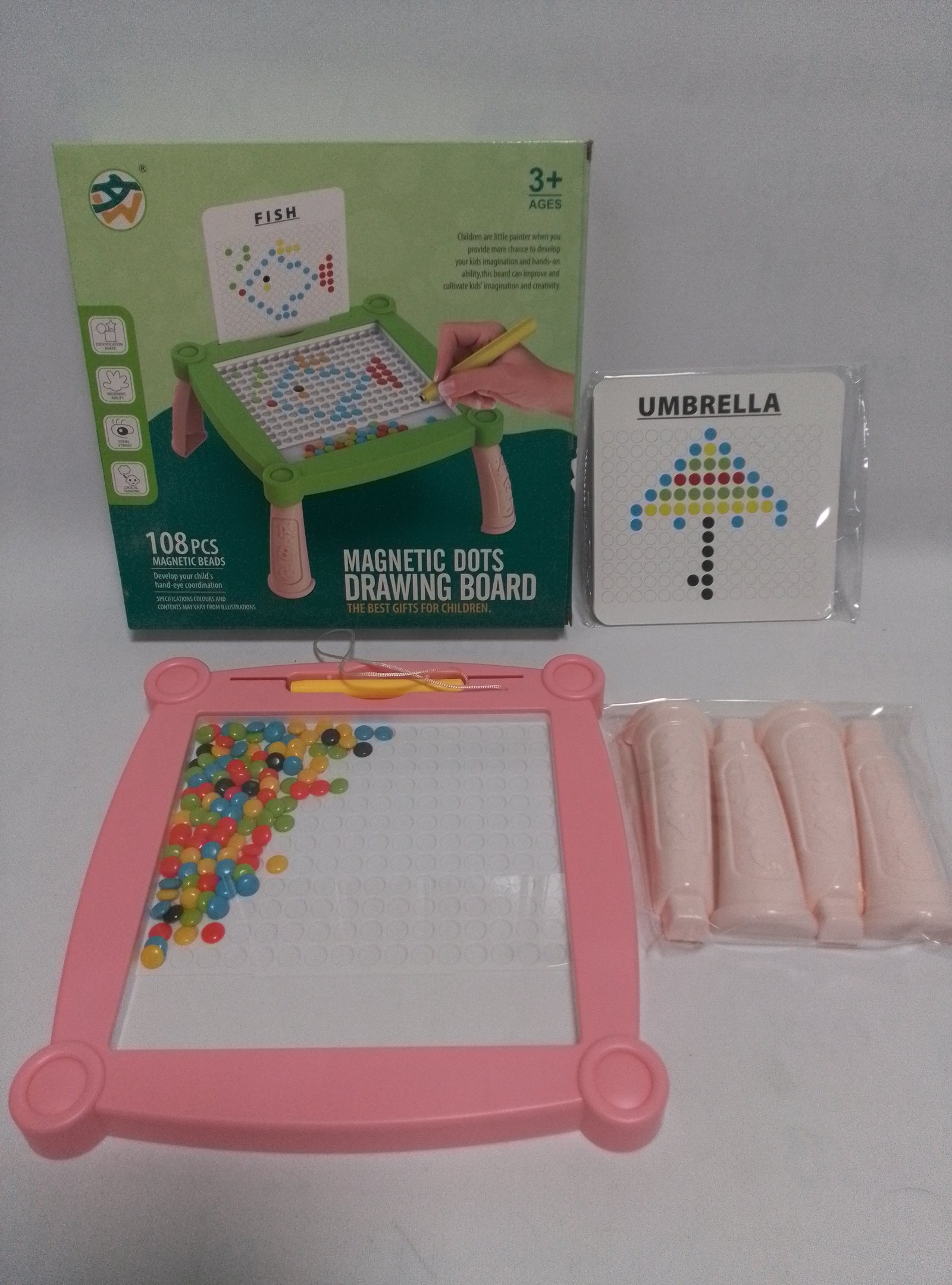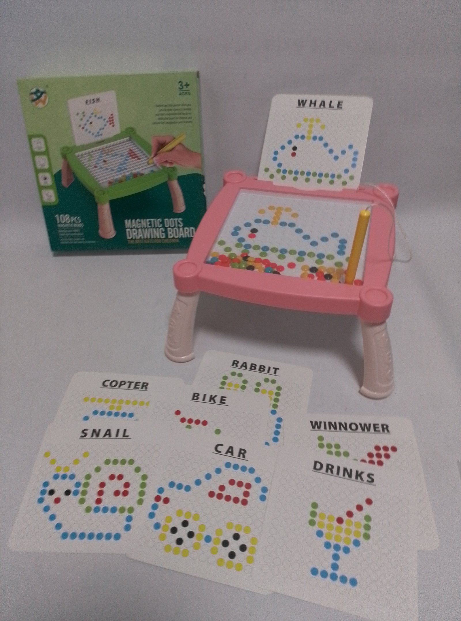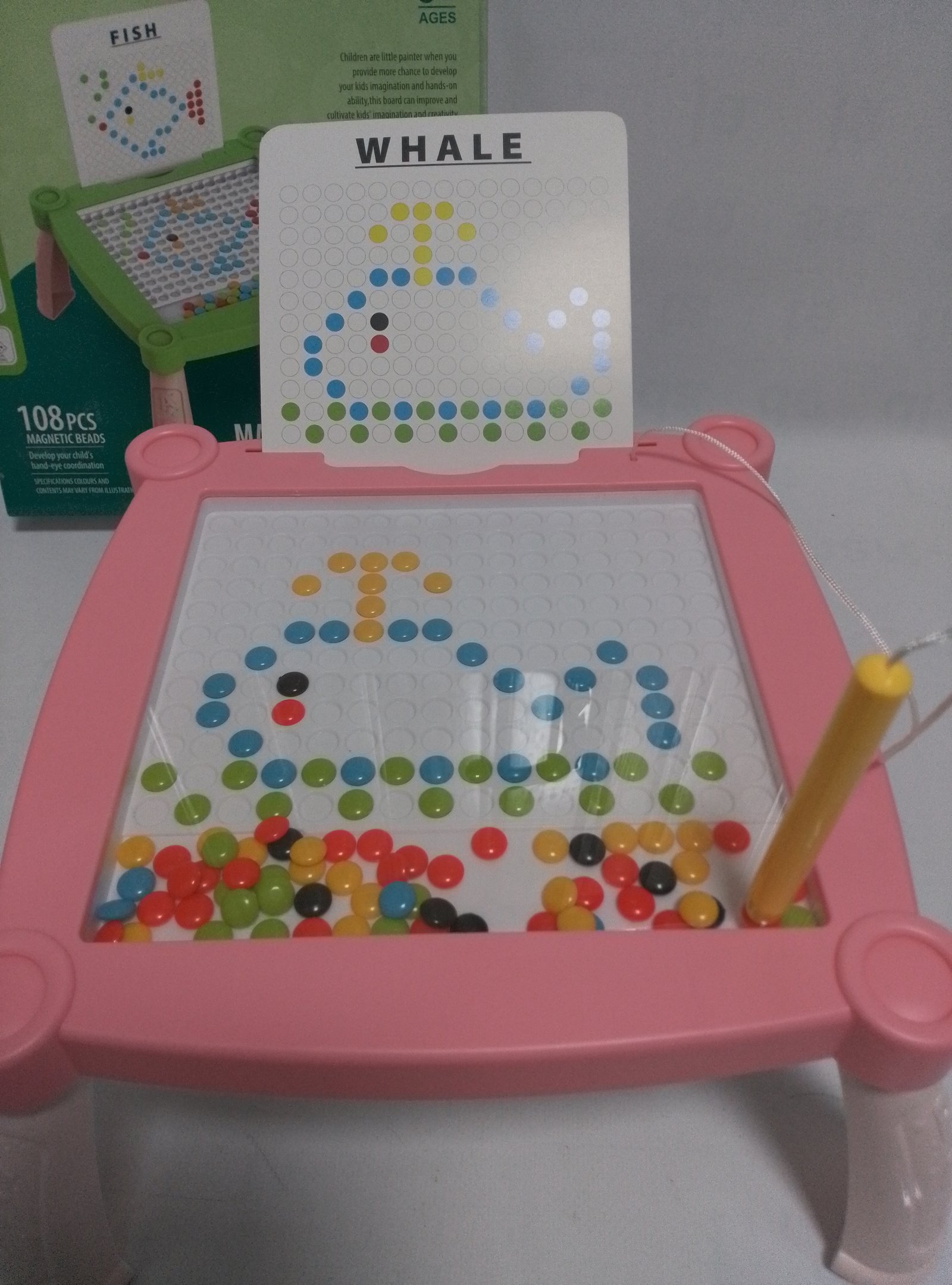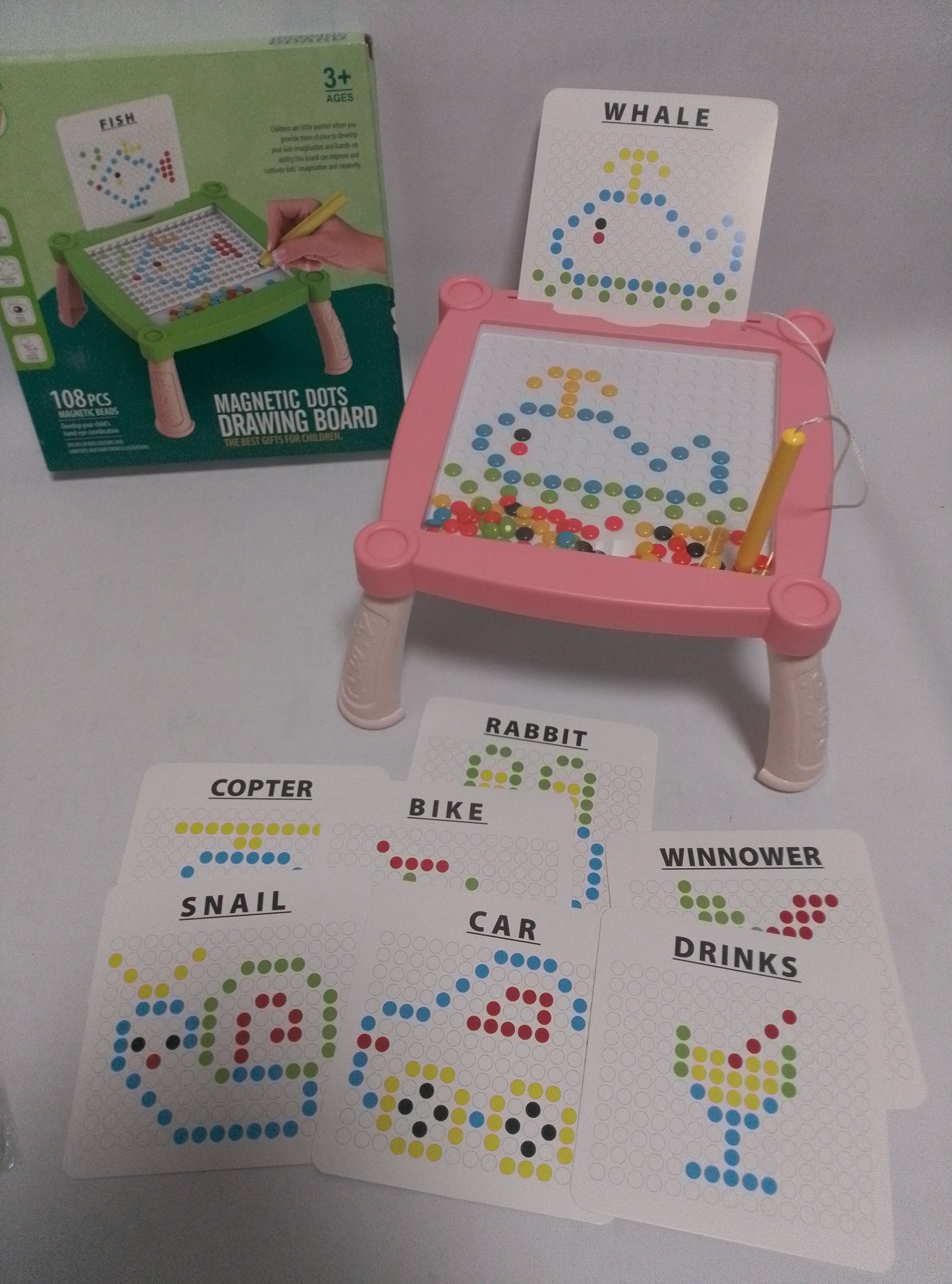 لعبة تعليمية رائعة تعتمد على التقاط الكرات المغناطيسية الملونة بواسطة القلم ونقلها إلى الأماكن المخصصة لتكوين الأشكال. يمرر الطفل القلم على الكرات أسفل السطح الشفاف غير العازل فتلتصق بالقلم، ثم يقوم بتحريكها ووضعها في الخانة المناسبة. تتكرر العملية مع باقي الكرات إلى أن يكتمل الشكل المطلوب. هذه الطريقة التفاعلية تجعل الطفل يركز ويتعلم باستخدام الحركة واللمس.