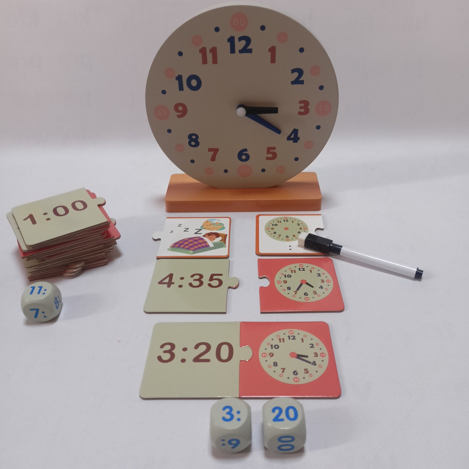 تجمع هذه اللعبة بين التعلم العملي والتفاعل، حيث يمكن للطفل التعرف على الوقت باستخدام الساعة، وتعلم الأرقام من خلال المكعبات، وربطها مع بطاقات تعليمية.